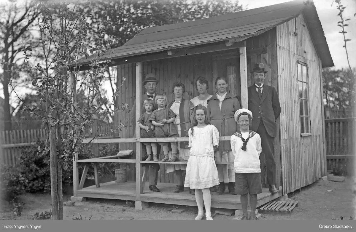 Finklädd grupp på verandan till sin kolonistuga, 1920-tal