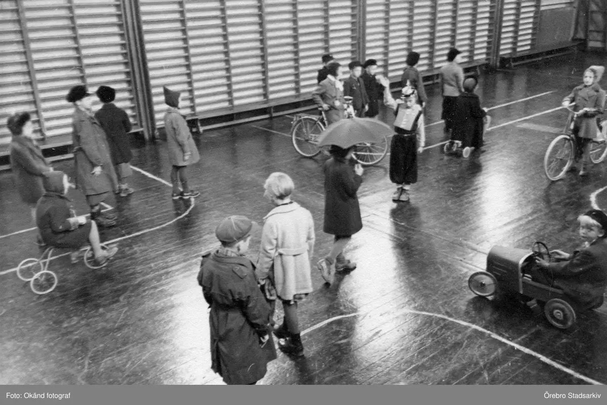 Trafikundervisning på uppmärkta gator i gymnastiksal vid skola i Örebo, 1941