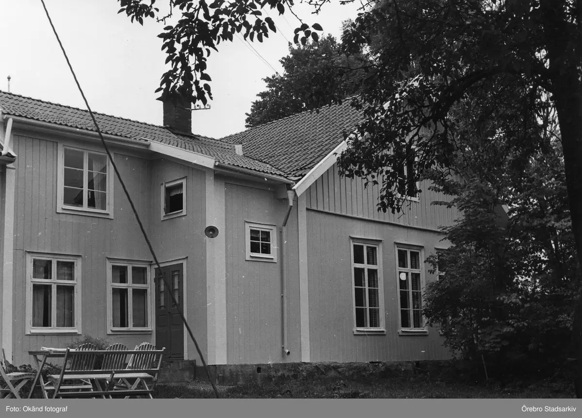 Trädgårdsmöbler framför dörr till Ekers skola i Längbro, 1948
