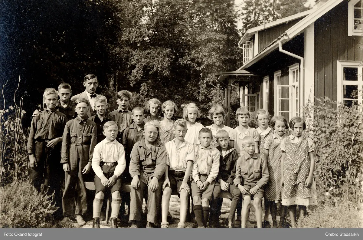 Skolklass sittande på långbänk vid Alltorps skola, 1930-tal