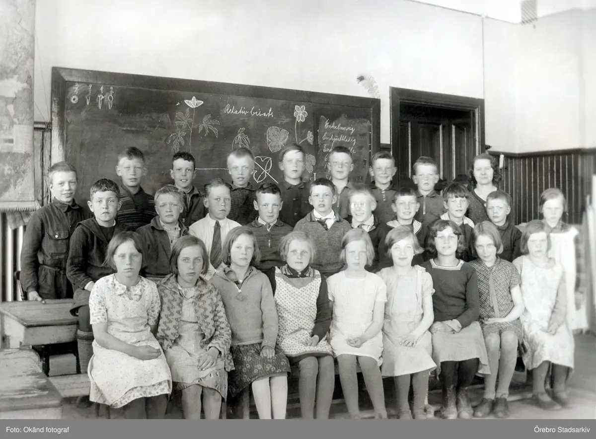 Lärare och elever inne i Mosjö kyrkskola, vårterminen 1932