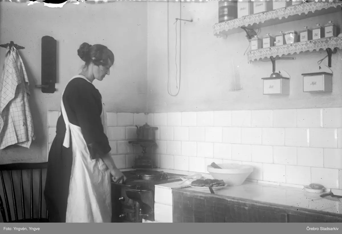 Kvinna gräddar våfflor på vedspis i köket, 1920-tal