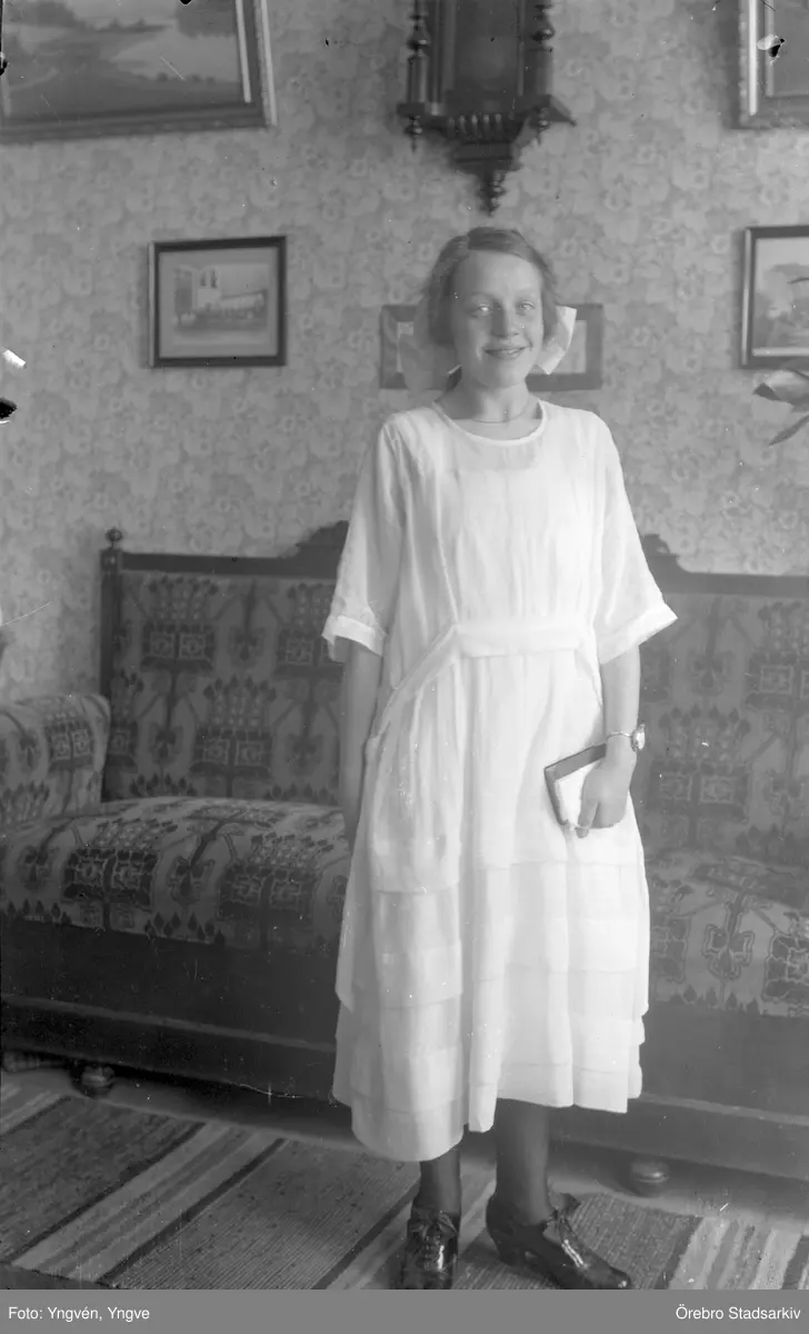 Konfirmand i vit känning och rosett med psalmbok i handen, 1920-tal