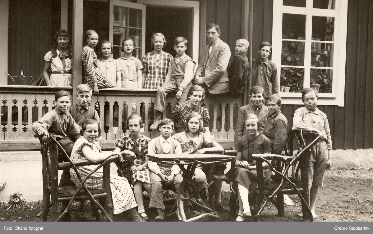 Skolklass på veranda och i utemöbler vid Alltorps skola, 1920-tal