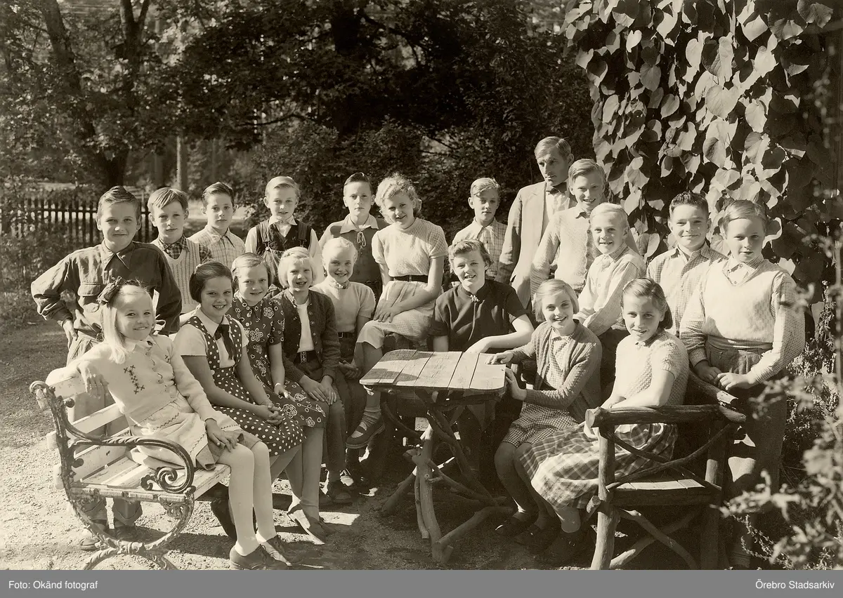 Skolklass sitter i trädgårdsmöblerna utanför Alltorps skola, 1950-tal
