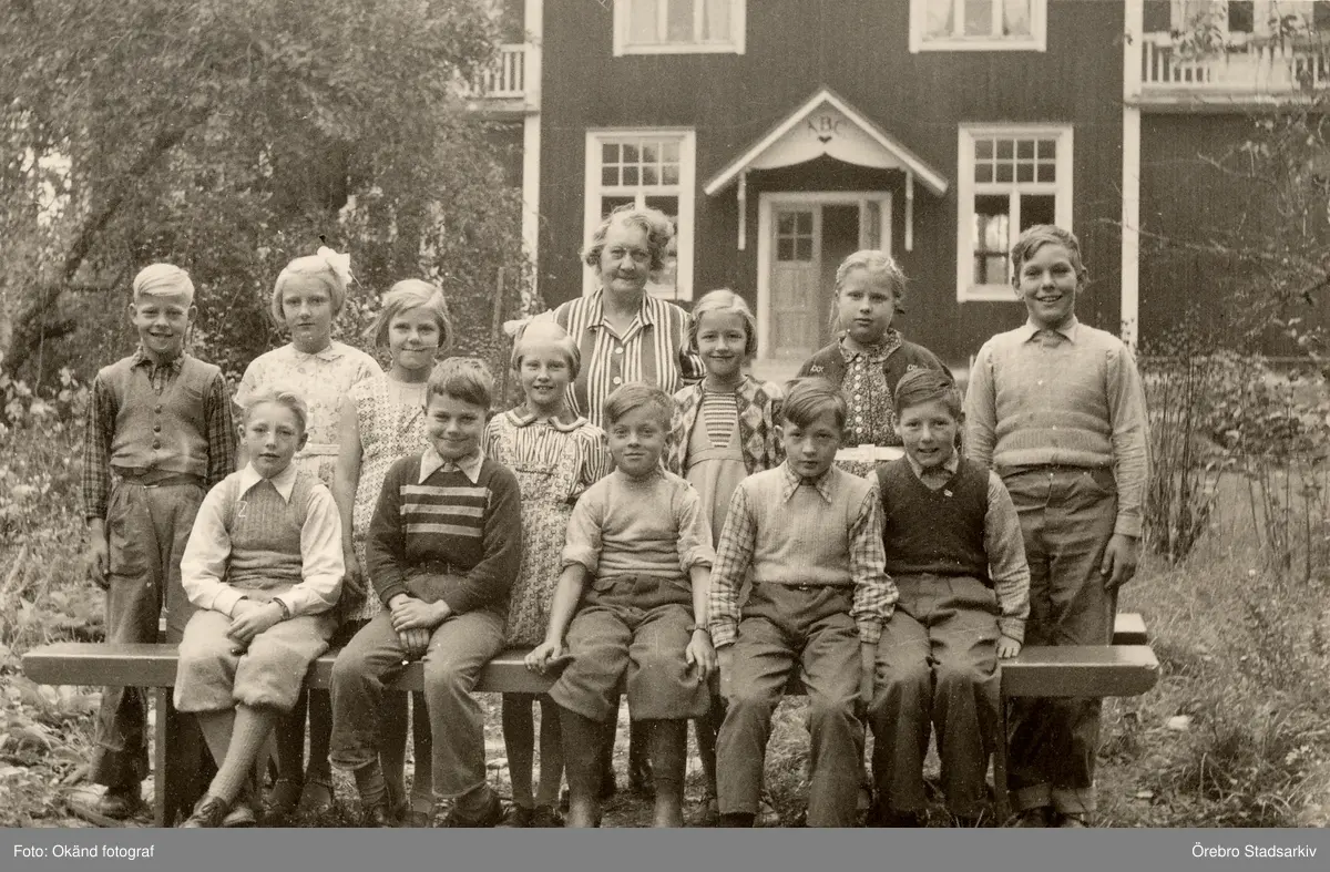 Skolklass med äldre lärarinna framför Alltorps skola, 1930-tal