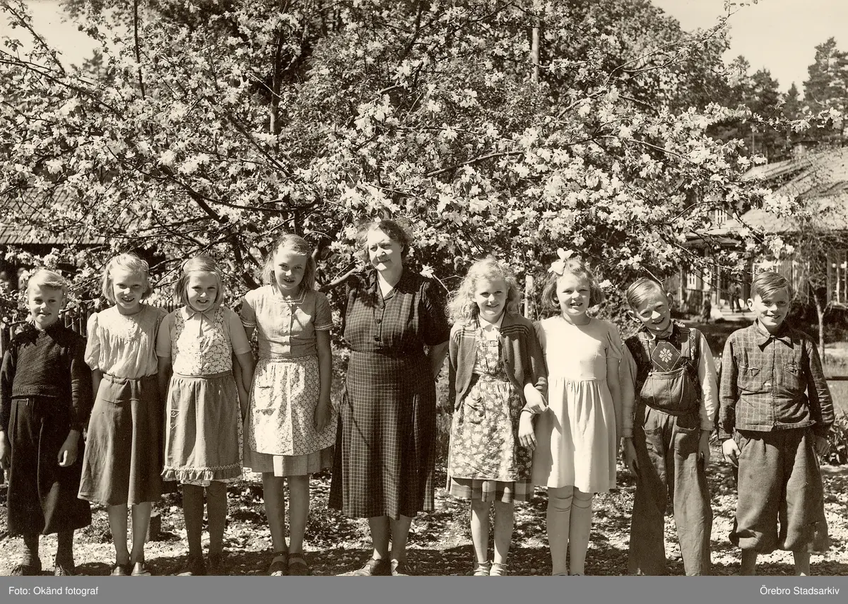 Elever med lärarinna framför blommande träd vid Alltorps skola, 1930-tal