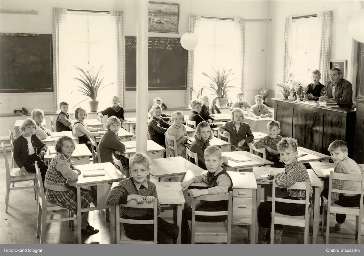 Eleverna i sina skolbänkar i Alltorps skola vänder sig mot kameran, 1940-tal