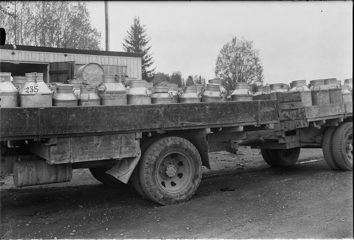 Lastbil från G. A. Janssons åkeri lastad med mjölkkärl har kört av vägen, Alunda, Uppland