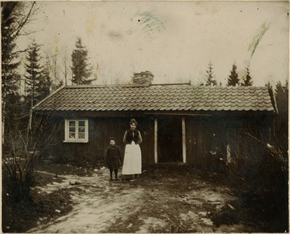 Titel: Kvinna och barn framför byggnad