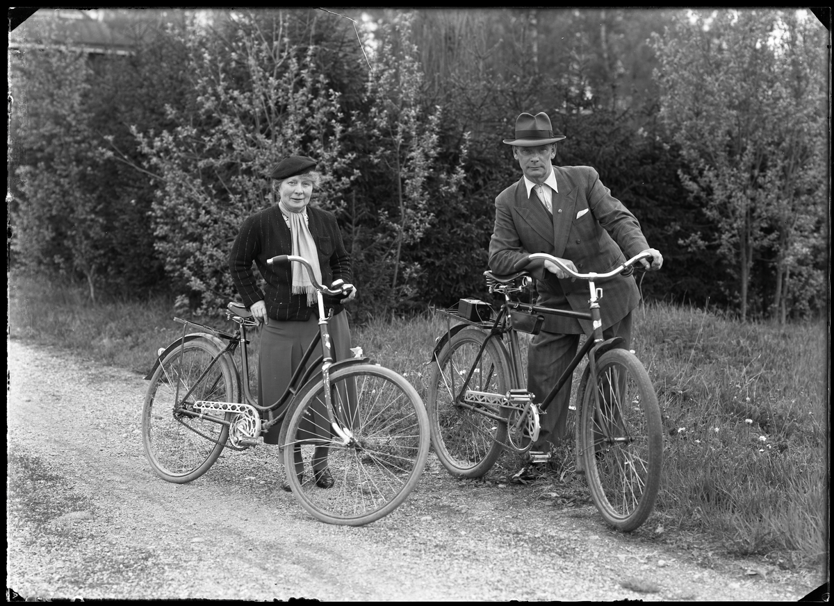 Två personer med cyklar. Axel Kreüger, Heleneborgsgatan 8C, 5tr, Stockholm.
