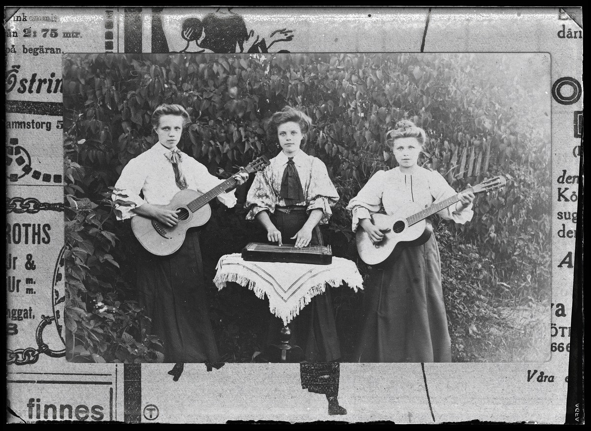 Tre personer med musikinstrument (reproduktion). Fru Emma Larsson, Sörstafors.