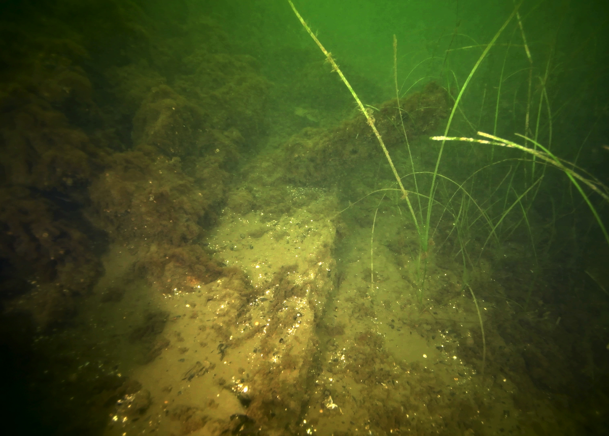 Ett spant samt delar av bordläggningen syns under stenpackningen.