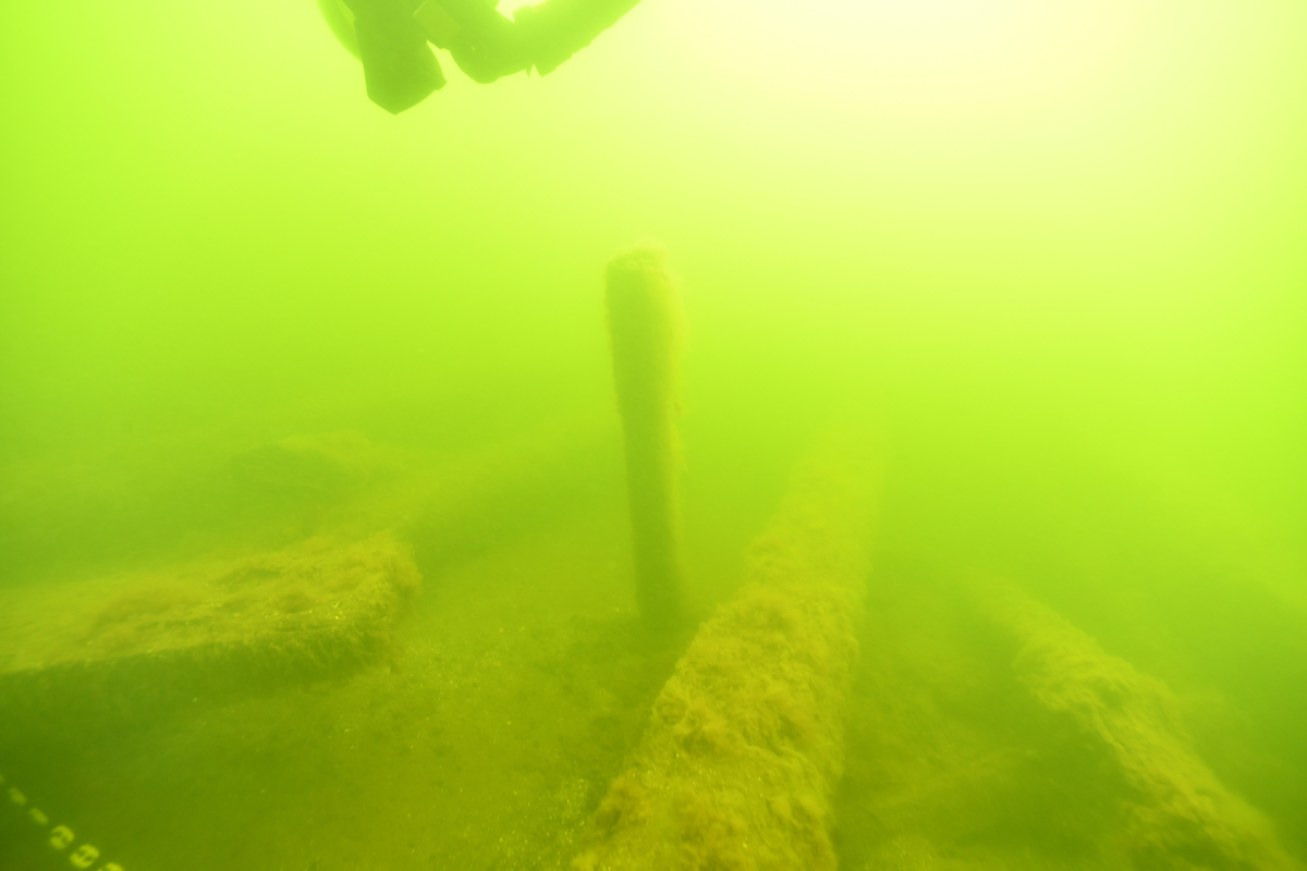 Ett av timren står lodrätt i vraket. Flera påträffades i lämningen