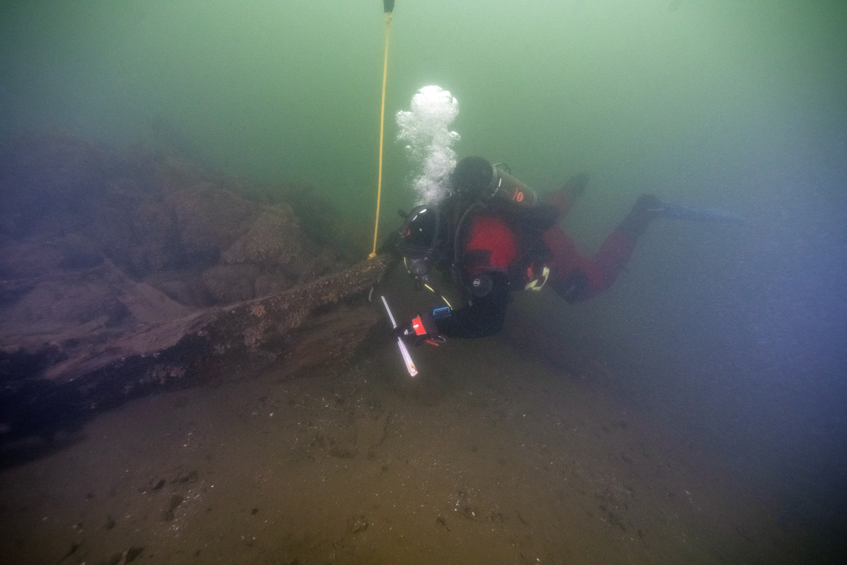Dokumentation av delar av kölen görs där förstäven bör ha suttit. Bordläggningen syns delvis även på denna bild