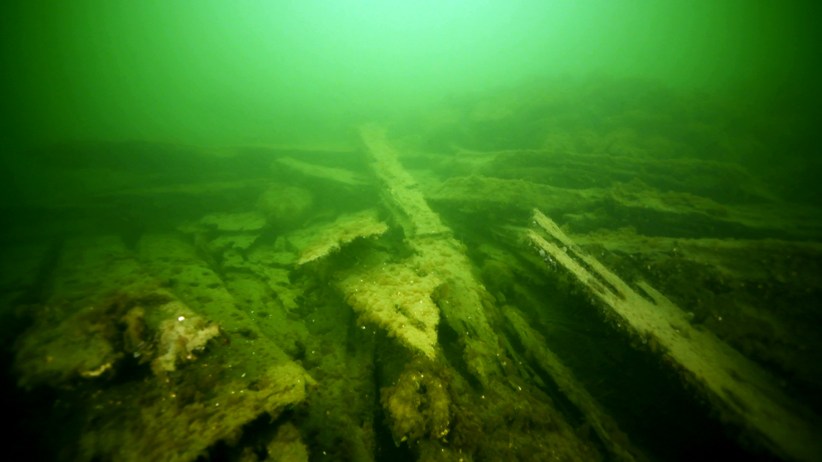 Stenhögen syns tydligt till höger i bildens förgrund. Del av den utfallna skrovsidan syns till vänster i bild