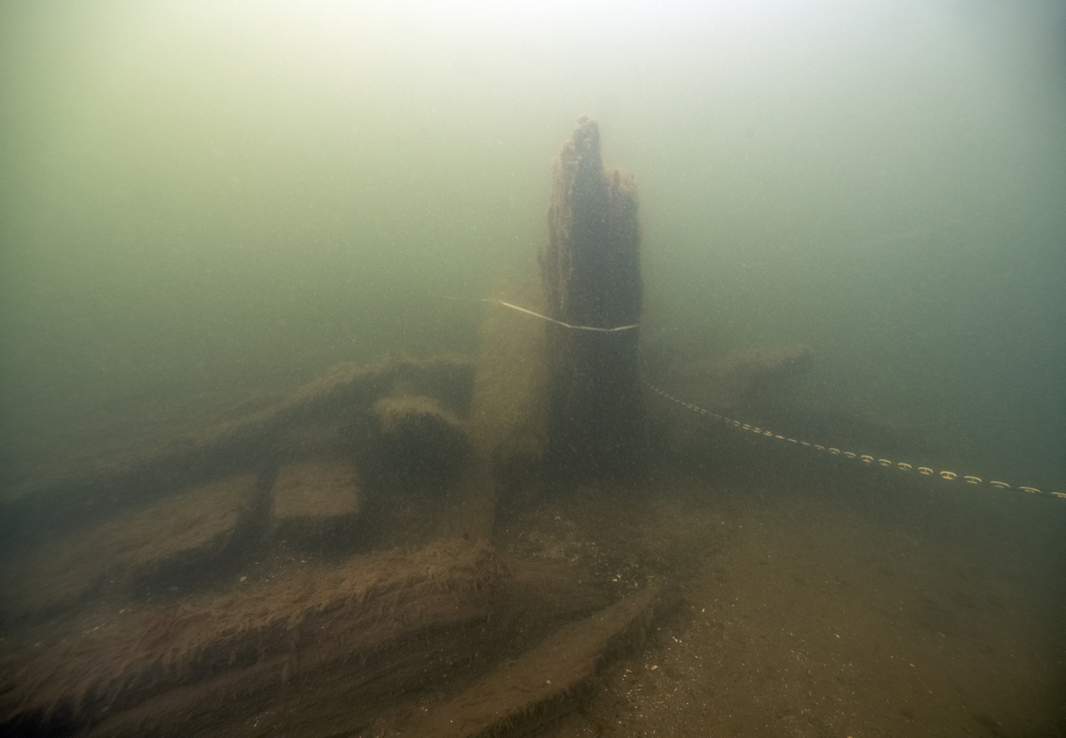 Akterstäven sedd akter ifrån. Plastkättingen till höger i bild fortsätter till SM3, norrut. Bordläggningen syns nu liggandes på botten. Dessa ser ut att ha varit anslutna till en vattenspegel. Alltså inte enligt det engelska maneret då borden böjs upp mot akterstäven