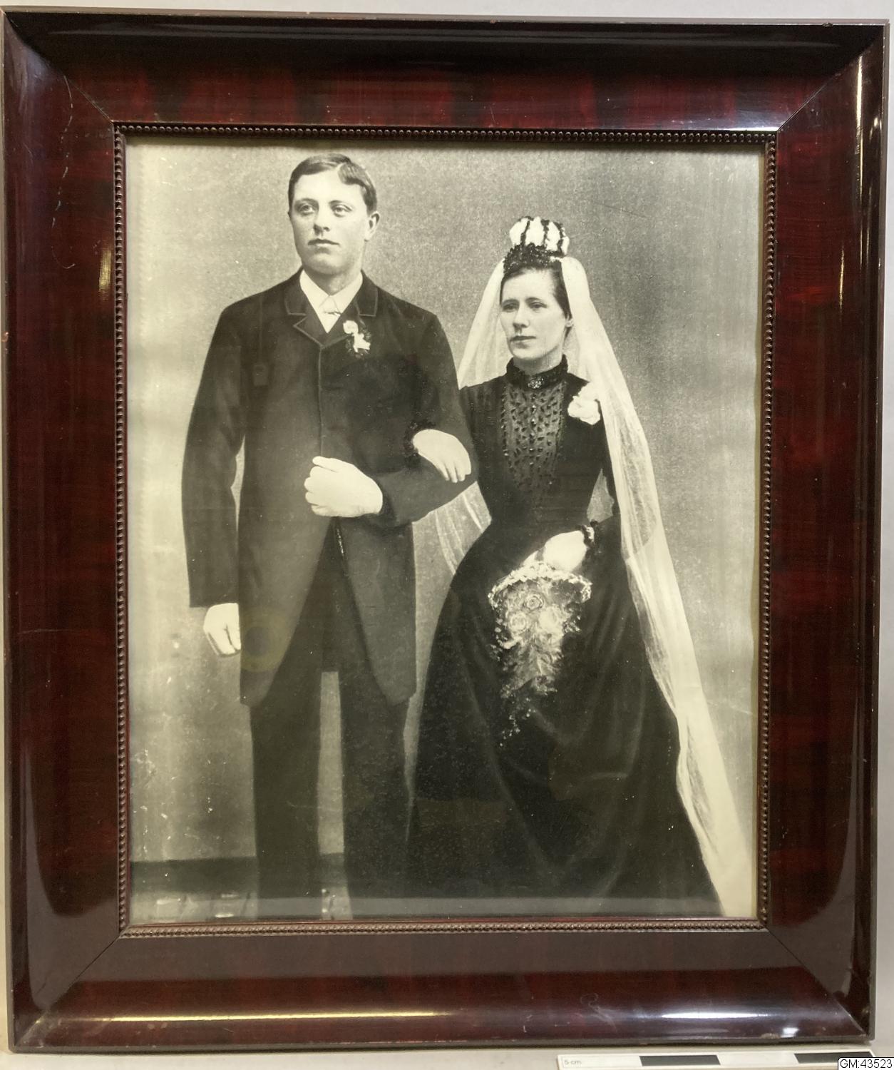 Ateljéporträtt (trol.) av brudpar. De avbildades identiteter är okända liksom fotograf.