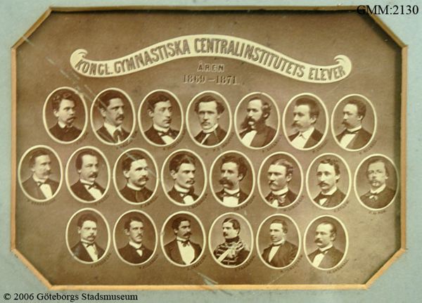 Tavla med tre fotografier föreställande Kongl. gymnasitiska centralinstitutets elever åren 1869-1870 resp 1869-1871 samt elever vid Marieberg åren 1867-1868.