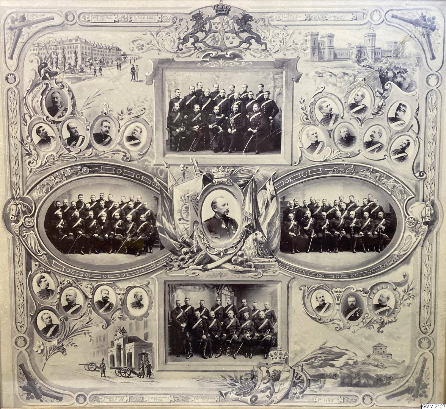 Tavla med fotografier över Kugl. Göta Artilleriregementes officerskår före regementets delning år 1893.