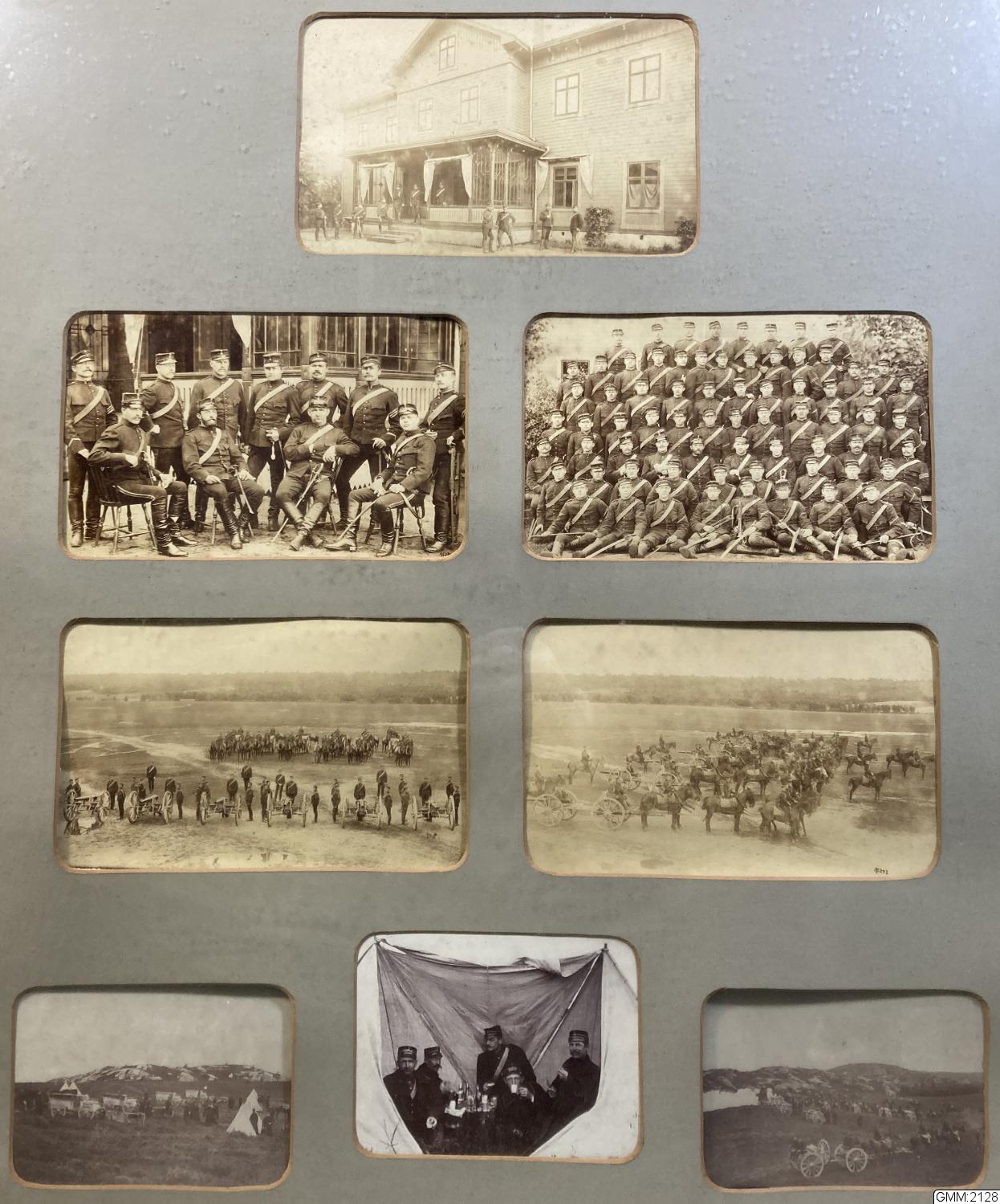Tavla med fotografier från Kungliga Göta Artilleriregementes övningar å Tångahed m.m.
