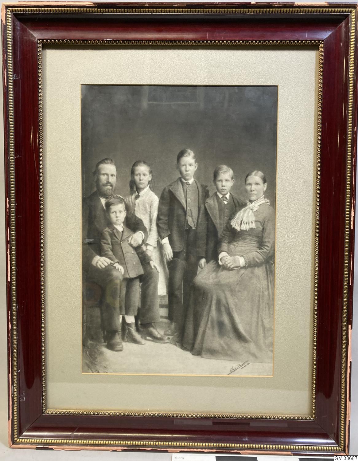 Inramat fotografi föreställande Carl Henrik Brolin med familj; hustru Anna Fredrika (f. Eriksson) och deras barn Axel 14 år, Helene 12 år, Ernst 13,5 år, samt Erik 7 år. Fotografiet taget av Olga Rinman år 1882.