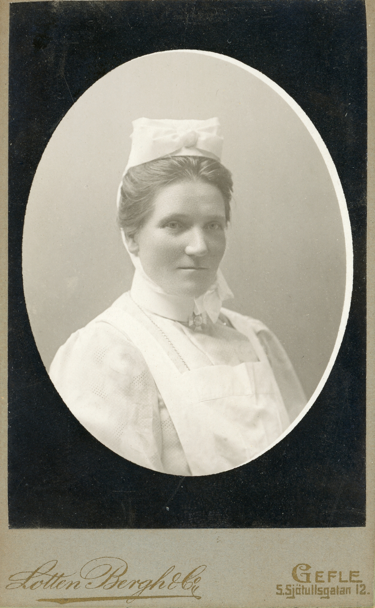 Porträtt av en kvinnlig sjuksköterska i sköterskedräkt.