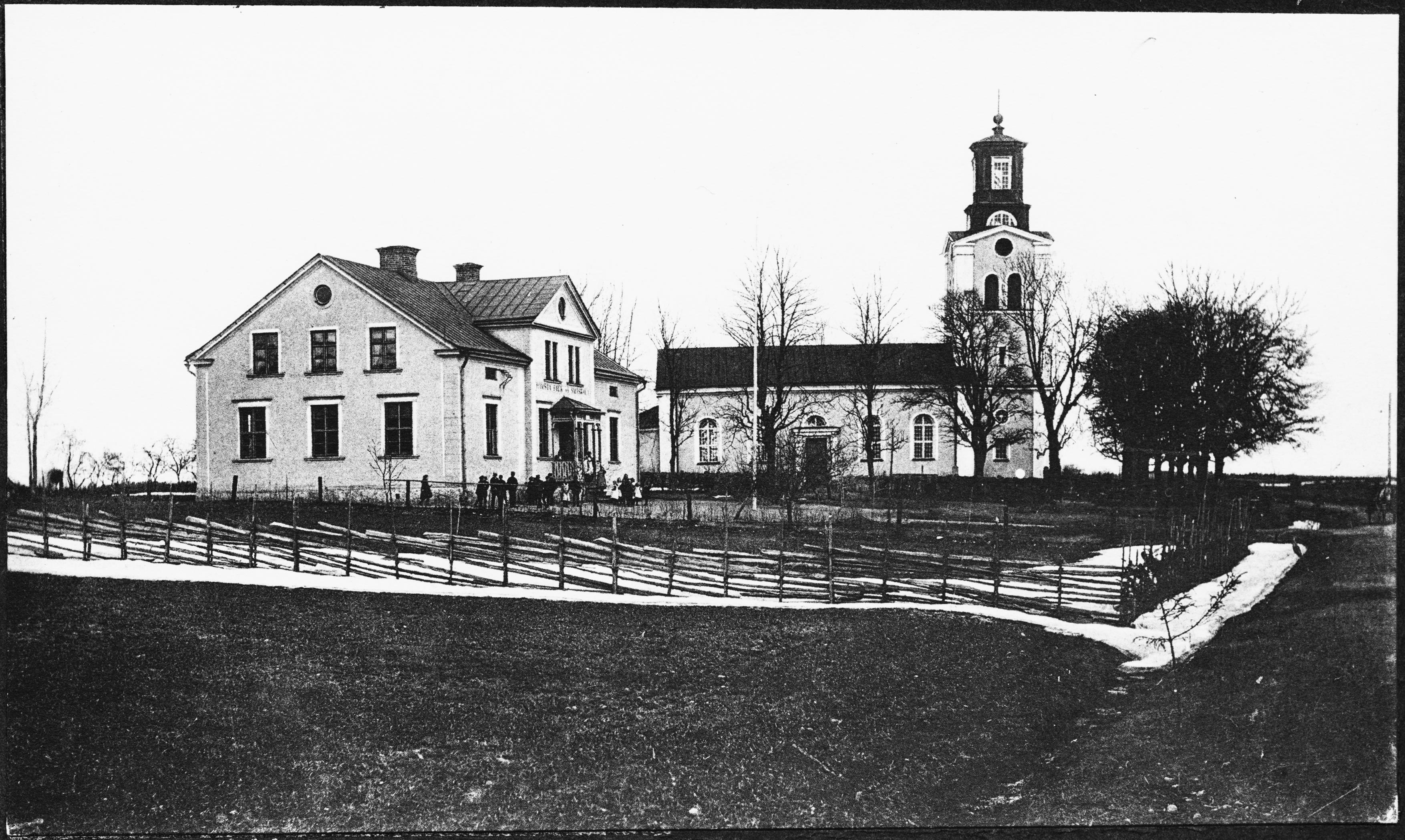 Kyrkan med omgivning, mot söder. Före branden 1914.