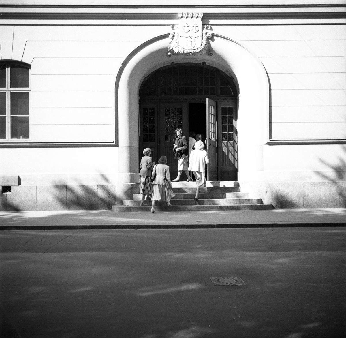 Ferieskolan börjar. Ungdomar utanför läroverket. Den 17 juli 1950