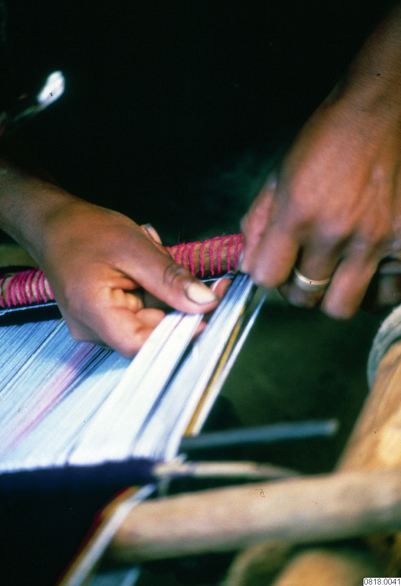 En människa som arbetar med textilier med hjälp av en vävstol.