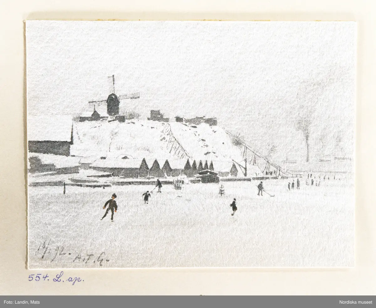 A T Gellerstedts akvareller, tillfällig utställning på Nordiska museet 7 april 2001. Akvarell från januari 1892. Vid "Grubbens gärde" på Kungsholmen.