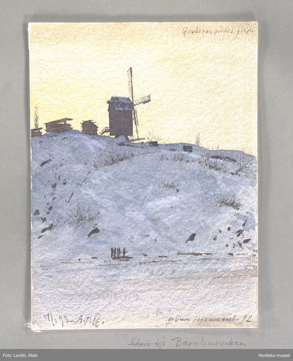 A T Gellerstedts akvareller, tillfällig utstälnning på Nordiska museet 7 april 2001. Akvarell från 17 januari 1892. Vid "Grubbens gärde" på Kungsholmen. "Qvarnen refs hösten -92". Barnhusviken.