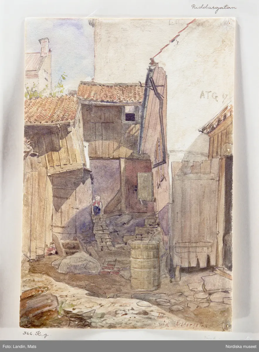 A T Gellerstedts akvareller, tillfällig utställning på Nordiska museet 7 april 2001. Akvarell från 1867. Bakgård vid Riddargatan.