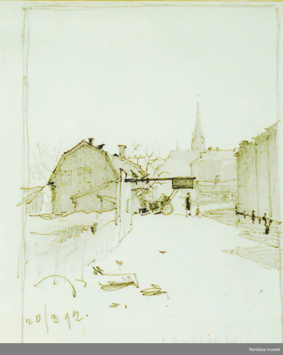 A T Gellerstedts akvareller, tillfällig utställning på Nordiska museet 7 april 2001. Akvarell från mars 1892. Tulegatans backe upp mot Johannes kyrka en solig dag.