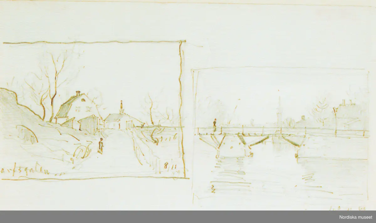 A T Gellerstedts akvareller, tillfällig utställning på Nordiska museet 7 april 2001. Akvarell från november 1889. Hus vid Pålsundet.