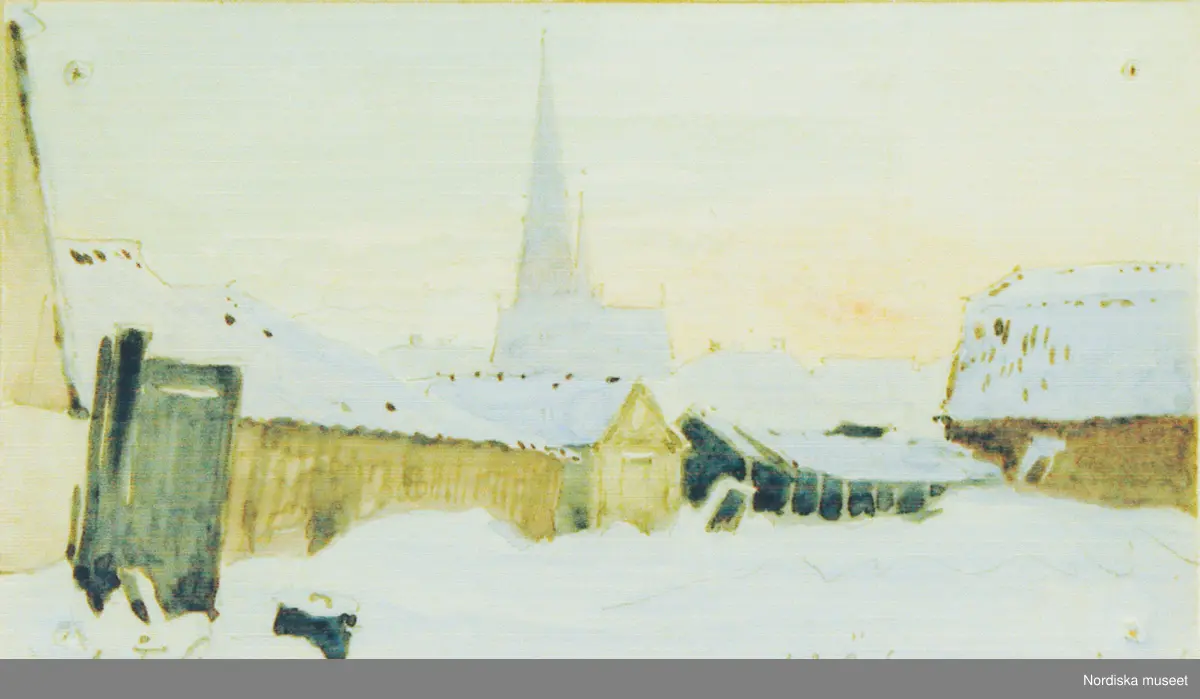 A T Gellerstedts akvareller, tillfällig utställning på Nordiska museet 7 april 2001. Akvarell från januari 1891. Johannes kyrka. Baksidan av visitkort.