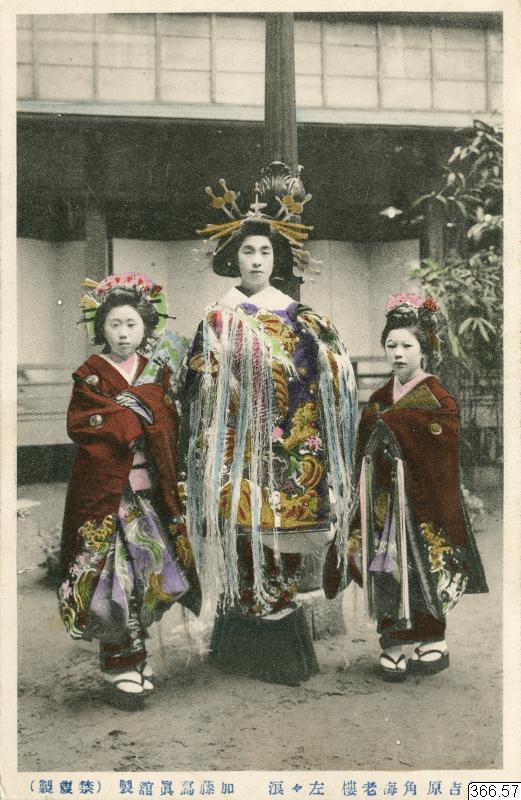 Porträtt på en kvinna omringad av två flickor i kimono. Vykort med porträtt med tre geishor med avancerade håruppsättningar med flertalet håraccessoarer och praktfull klädsel, kvinnan i mitten har extra höga plattformar på sina Geta. Text på framsida: "Text på annat språk." Text på baksida: "Union Postale Universelle. CARTE POSTALE, Text på annat språk."