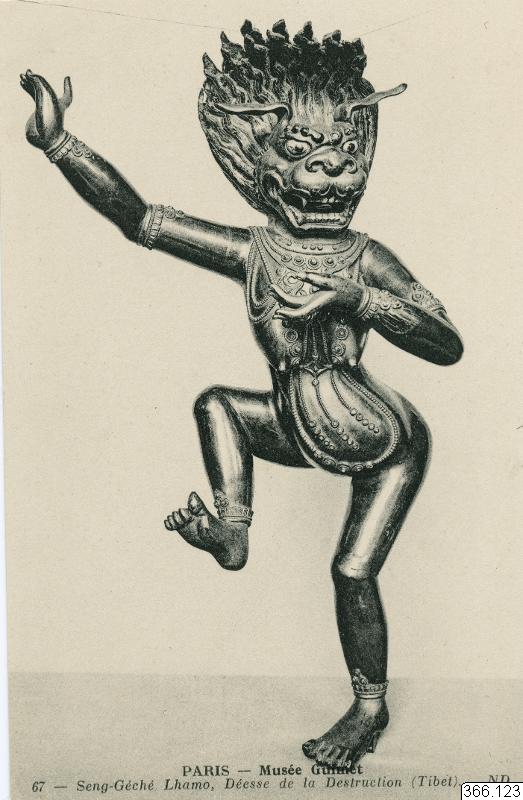 Vykort med motiv föreställande poserande människofigur med bestliknande behornat huvud i utsmyckad utstyrsel. Figur av Förstörelsegudinna, del av Lhamo teater. Tibet. Text på framsida: "PARIS - Musée Guimet, 67 - Seng Géché Lhamo, Déesse de la Destruction (Tibet). ND." Text på baksida: "POST CARD, Carte Postale, POSTKARTE, BRIEFKAART - POSTKAART, CARTOLINA POSTALE, Text på annat språk, TARJETA POSTAL."
