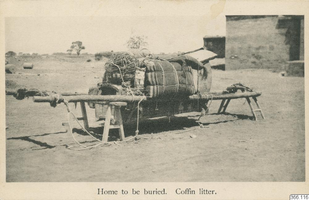 Vykort med motiv av kista med fastsurrade tillbehör, liggandes på träpålar uppstöttade av träbänkar, byggnad i bakgrunden samt avlägsna träd. Kista på väg hem för begravning. Text på framsida: "Home to be buried. Coffin litter." Text på baksida: "POSTKARTE, Carte postale, Cartolina postale, Post card, Text på annat språk, CHAS. F. GAMMON PHOTO SERIES. NO. 15."
