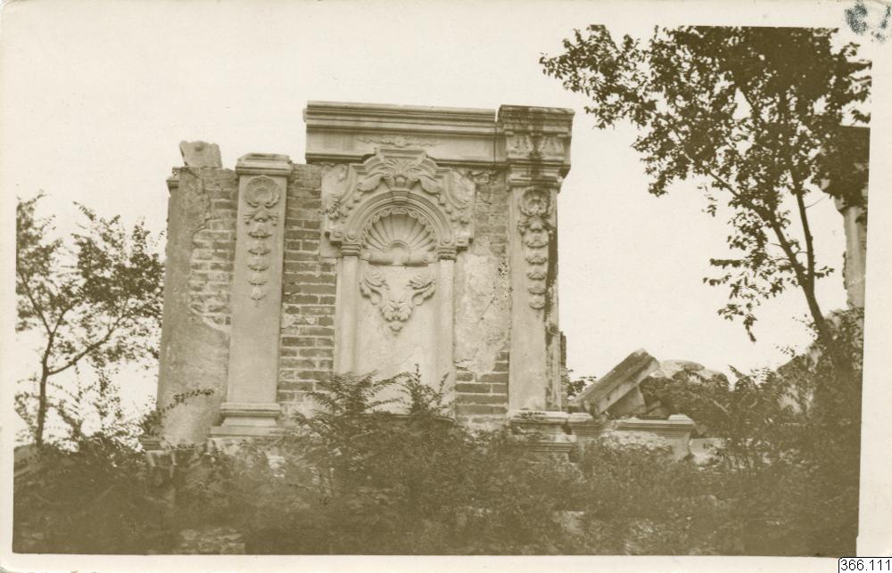 Vykort med motiv av ruiner, en raserad vägg med utsirade dekorationer omgiven av växtlighet och träd. Yuanmingyuan eller Gamla sommarpalatset; ruiner från Quingdynastin. Peking, Kina. Text på baksida: "Gamla Sommarpalatset w. oläsligt, s."