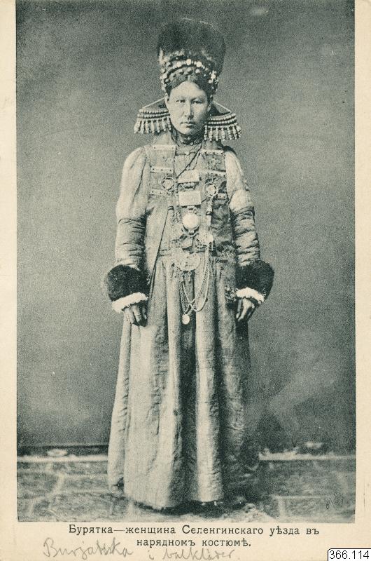 Vykort med porträtt av kvinna med högrest dekorerad håruppsättning, klädd i uppstående krage med hängande pärlor och långärmad långklänning med fluffiga armkuffar vid vristerna, stengolv, textil hängande som bakgrund. Burjatisk kvinna i balklänning. Text på framsida: "Text på annat språk, Burjanska i balkläder." Text på baksida: "Text på annat språk, CARTE POSTALE (delvis dolt bakom frimärke), Text på annat språk."