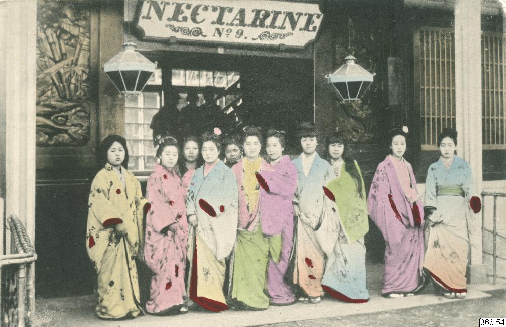 Vykort med kolorerat porträtt med prostituerade uppradade i kimonos framför entrén på bordellen Nectarine No 9 i Yokohama. Text på framsida: "NECTARINE no 9" Text på baksida: "Carte postale - Postkarte - Post Card, Cartolina Postale - Dopisnice - Levelezö-Lap - Karta korespondencyjna - Briefkaart Correspondenzkarte - Tarjeta postal - Brefkort - Text på Ryska. Fr oläsligt i Yokohama, No 9, Madame Oläsligt, vackra blommor, Made in Japan, Text på annat språk."