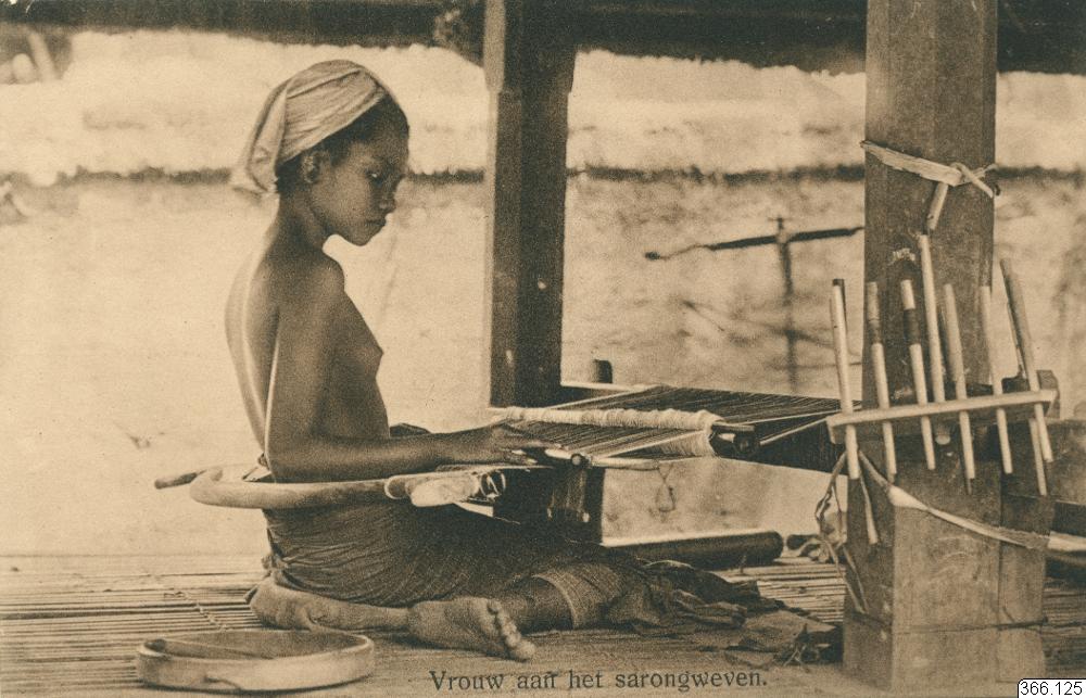 Vykort med motiv av kvinna med hår i virad huvudbonad, bar överkropp och kjol som sitter ner på strågolv och väver en sarong på en vävstol, verktyg intill på golvet. Text på framsida: "Wrouw aan het saronweven." Text på baksida: "Briefkaart, Text på annat språk, Adres, Kartoe pos. Alamat, Uitgave: J.M . Chs. Nijland, Societeitstraat, Soerabaia."
