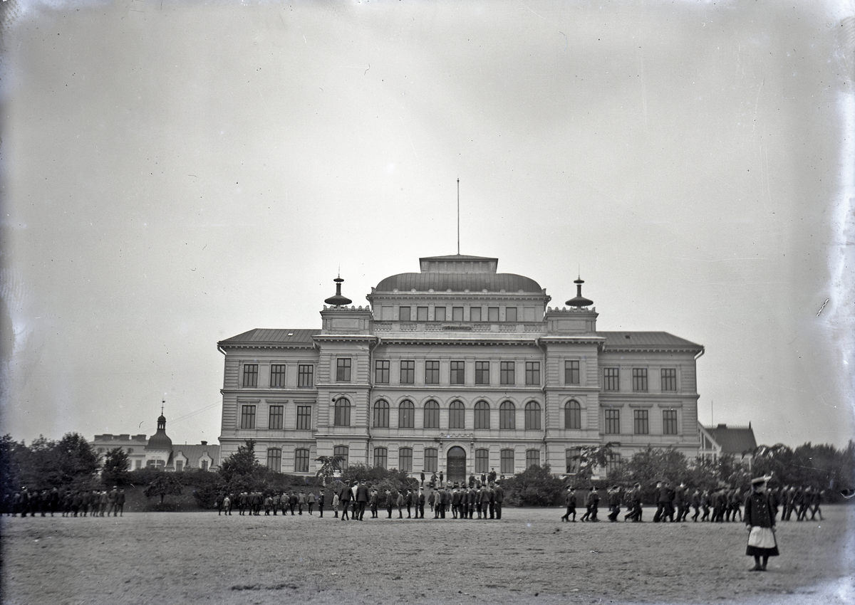 Vy mot Växjö Högre Allmänna Läroverk. På skolgården håller man på med att marschera m.m.