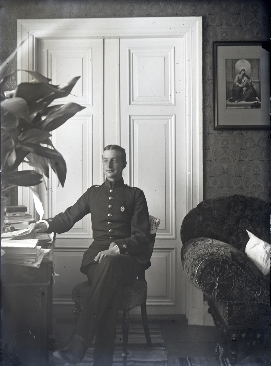 Porträttfoto av en ung man i militäruniform. Han sitter vid ett skrivbord, vid ett fönster. Bakom sig har han en dörr och till höger skymtar en stor soffa.