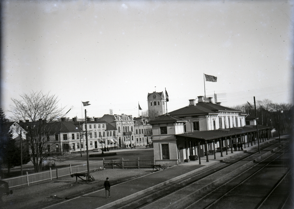 Järnvägsstationen i Växjö, trol. en tidig morgon. Flaggan (med unionsmärke) är hissad. Bakom stationen syns husen vid Norra Järnvägsgatan (kvart. Linné) och domkyrkans torn.