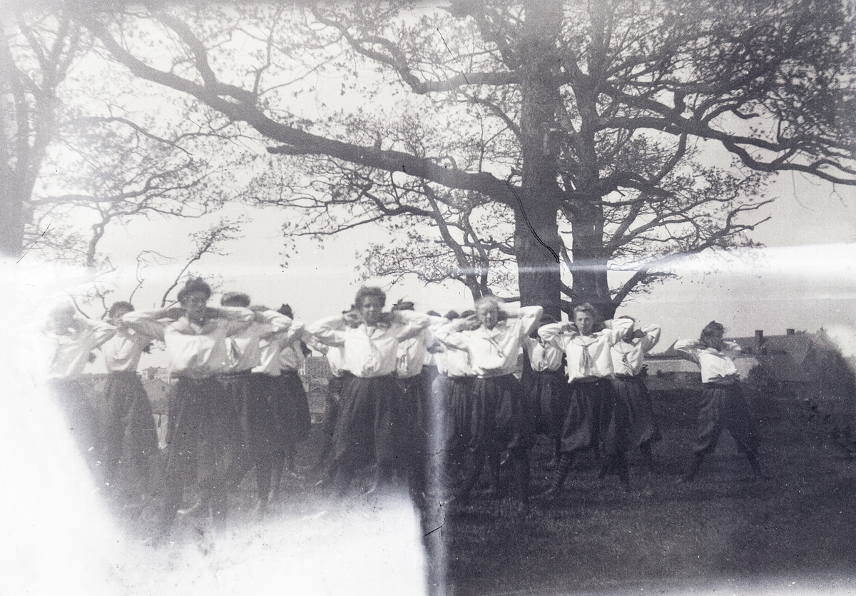 En grupp kvinnliga gymnaster i sjömansblus och s.k. ballongbyxor, som övar utomhus.
