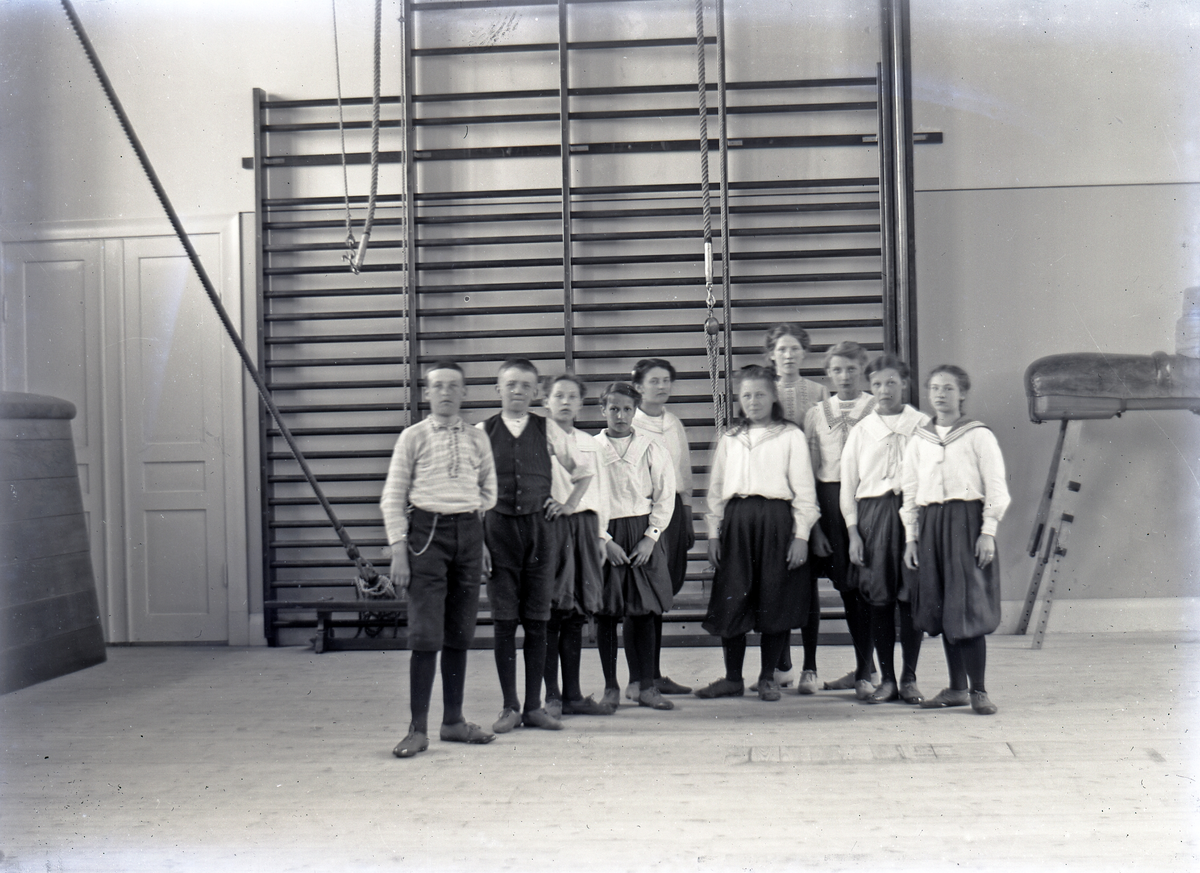 En mindre skolklass, uppställda i en gymnastiksal, klädda för gymnastik.