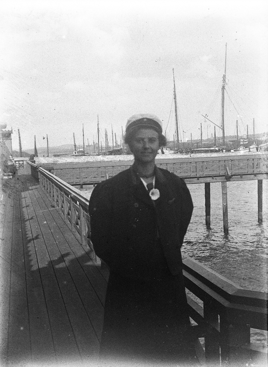 Foto av en ung kvinna i studentmössa, som står på bryggan utanför kallbadhuset i Varberg. I bakgrunden skymtar ett antal segelfartyg.