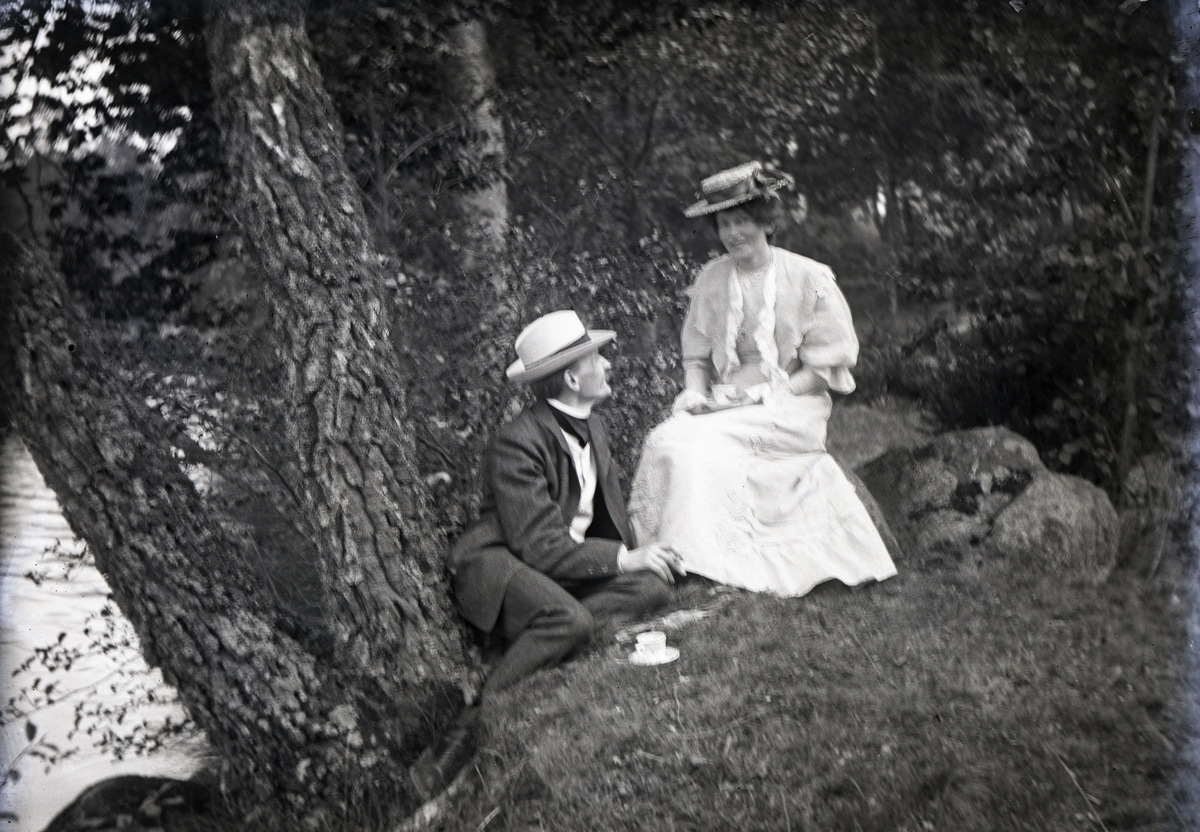 En man och en kvinna har slagit sig ner tillsammans, vid en stenig sjöstrand.